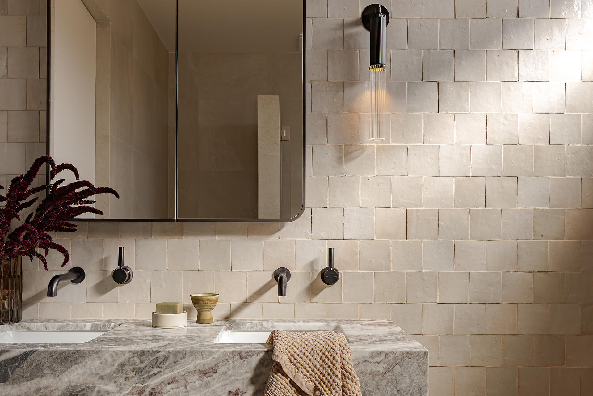 In the Award Winning Autumn House project, our Moroccan Zellige Rosa tiles become a study of light and texture. Each piece is individually handcrafted, creating subtle variations that shift throughout the day. Laid in a running bond pattern, the tiles bring organic warmth alongside the marble vanity and black tapware.