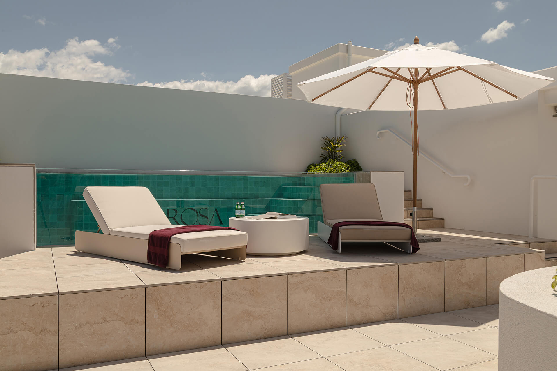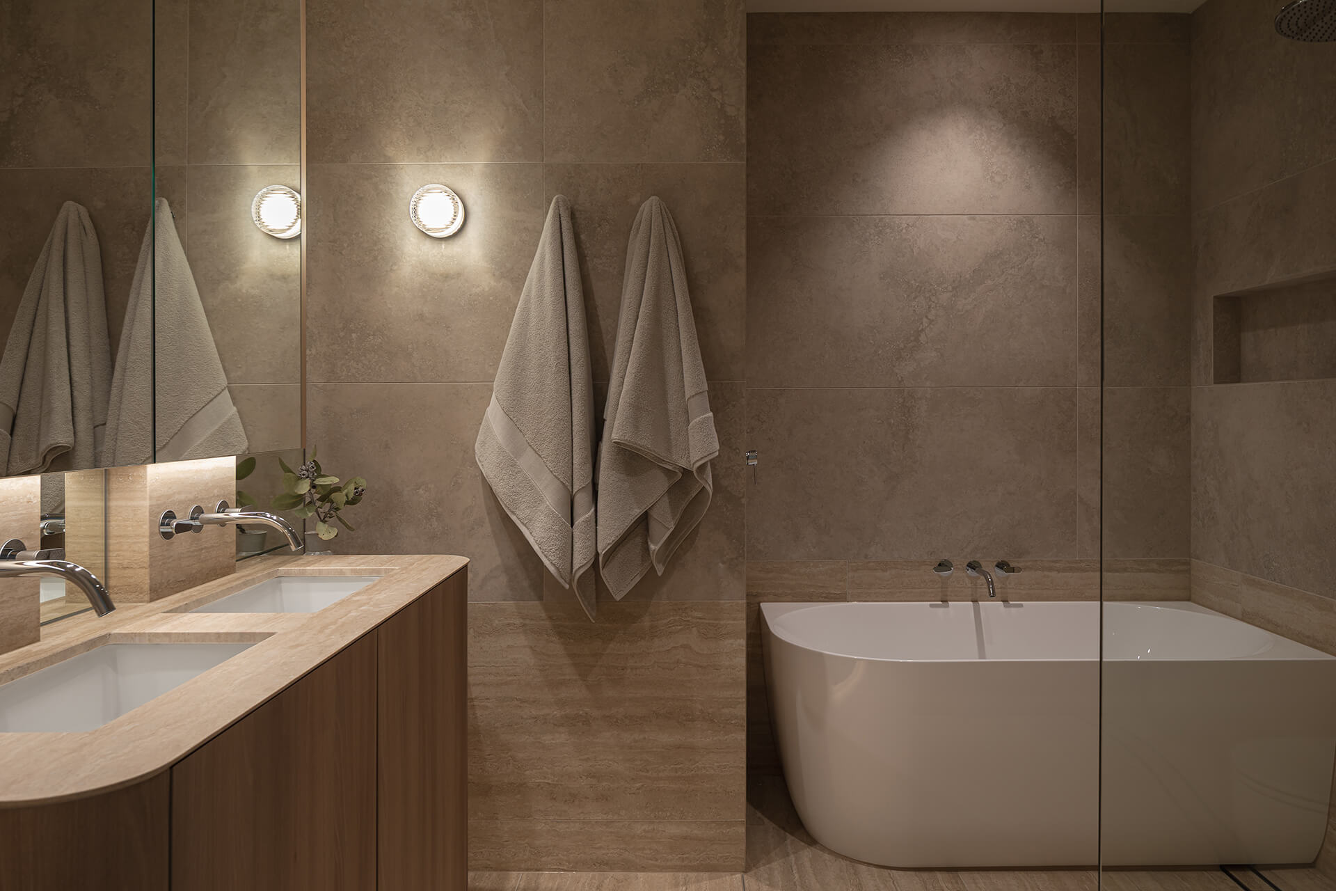 The project demonstrates a considered approach to materiality and detailing, with finishes selected to balance durability, performance and timeless aesthetic appeal. Surface Gallery supplied a curated palette of stone and porcelain surfaces, including Roman Travertine Porcelain Pavers and Caterina Crazy Paving for external areas, alongside Roselli Classic Travertine and Alabastrino Natural Cross Cut internally, providing texture and tonal depth throughout the bathrooms. Sukabumi Green Square Edge tiles were was incorporated as a feature element in the rooftop pool, introducing a natural, refined contrast. Together, these materials contribute to a cohesive architectural language defined by quality, longevity and thoughtful design integration.